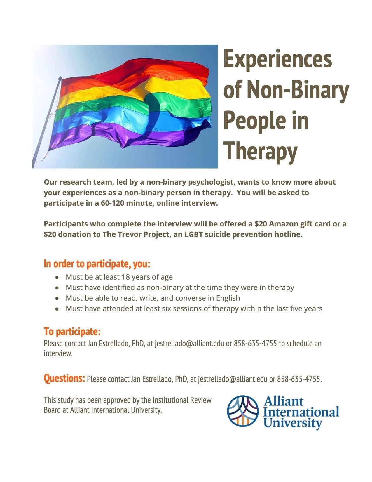 To participate or for questions, please contact Jan Estrellado, PhD, at jestrellado@alliant.edu or 858-635-4755 to schedule an interview.